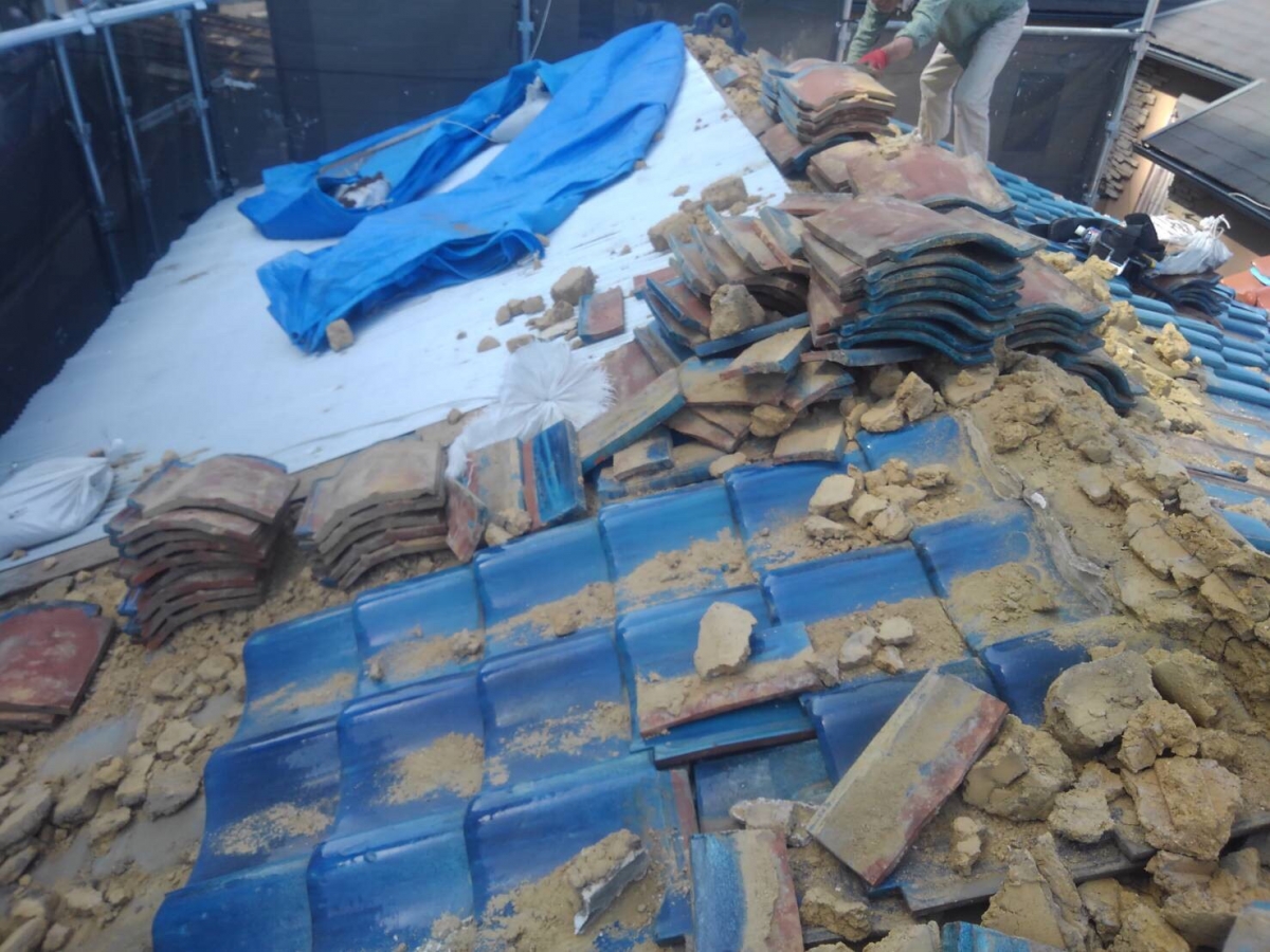 屋根瓦の撤去よりも、土の撤去の方が大変です。土に関しては、いくら足場を組んでいても撤去作業中に土埃が舞い上がってしまいますので、慎重な作業が求められます。