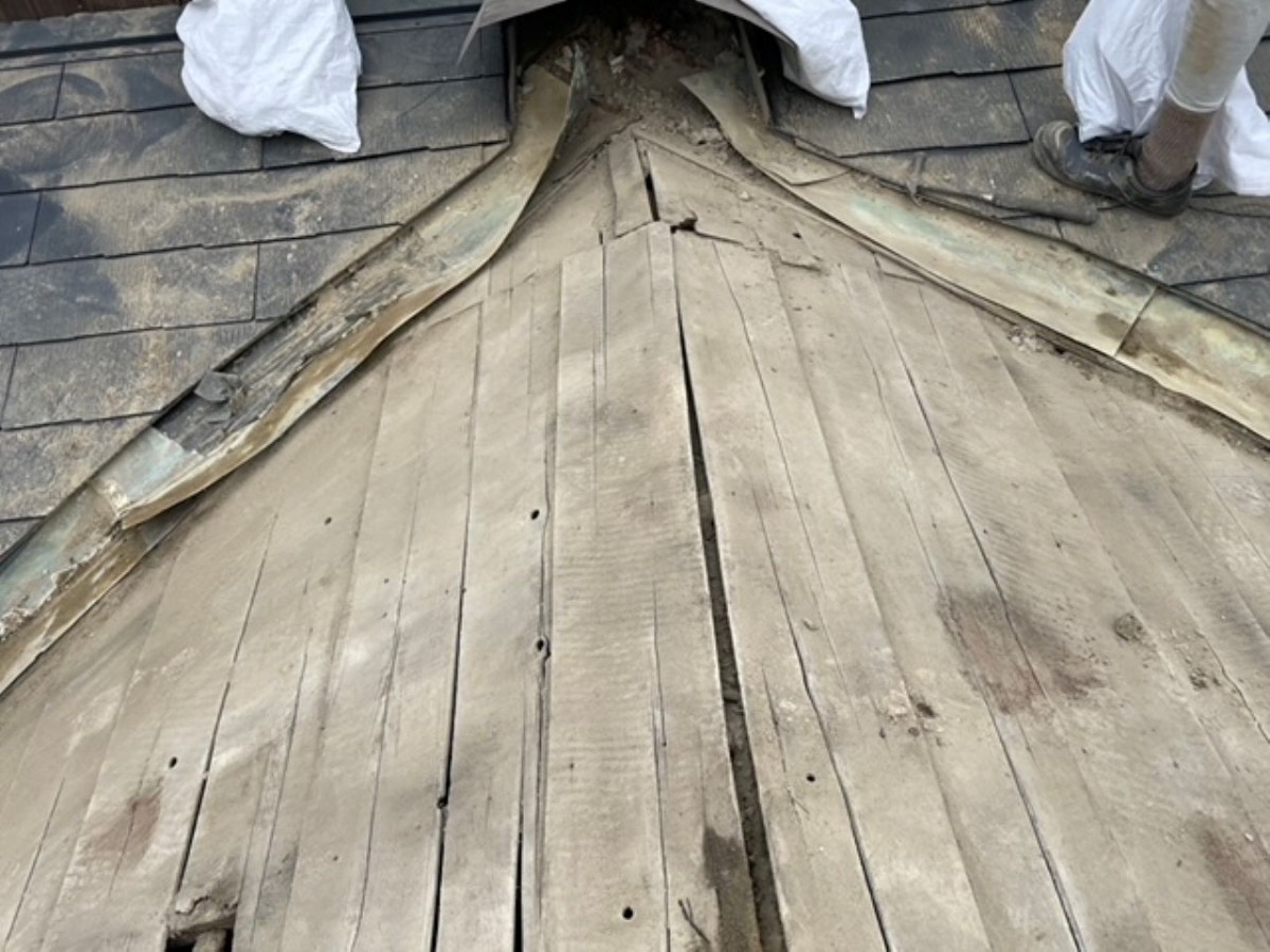 谷板は穴が開き、棟は、建物の築年数の経過により、瓦の重量で少し下がり、弯曲している状態でした。