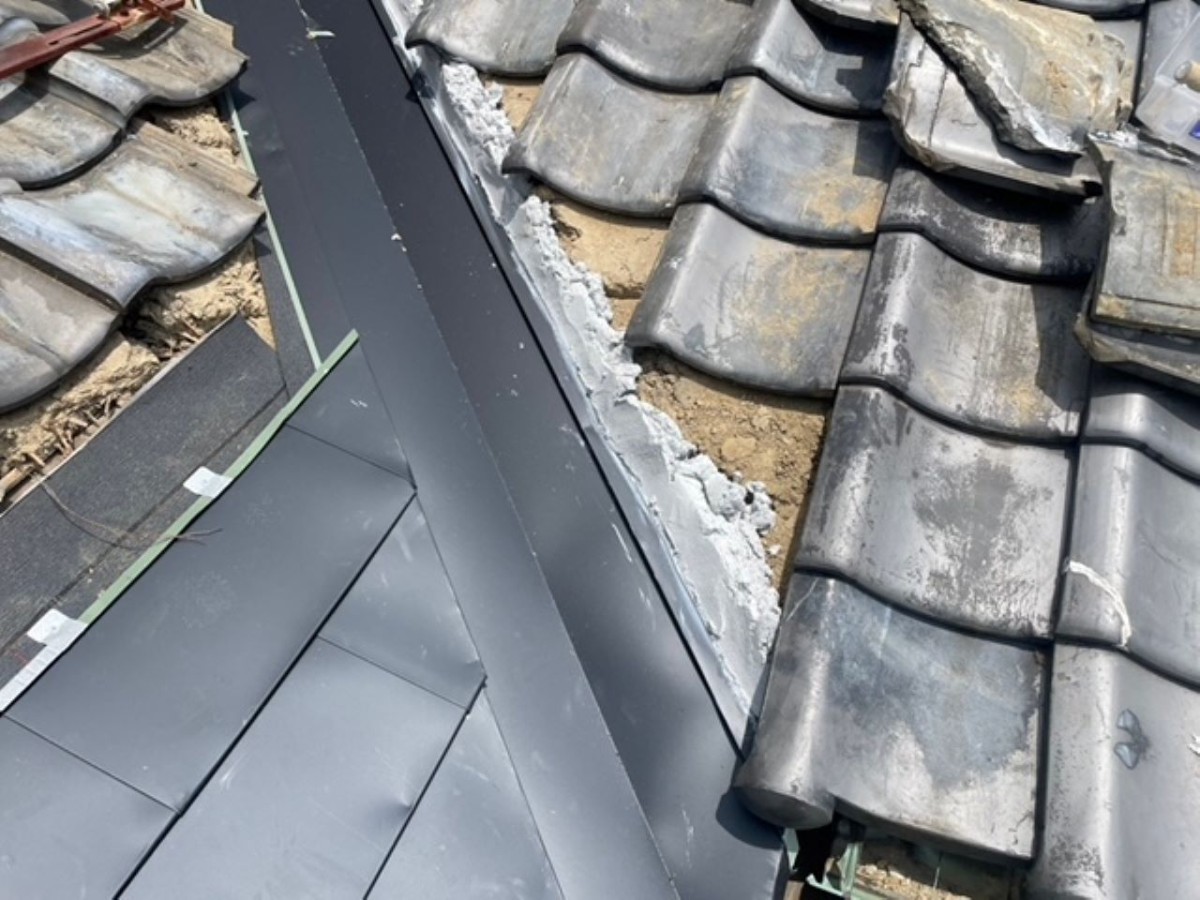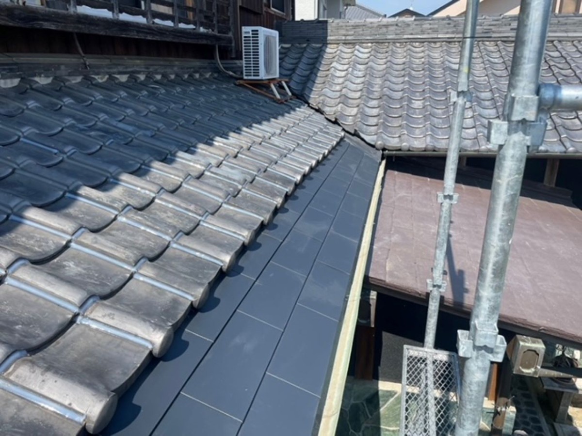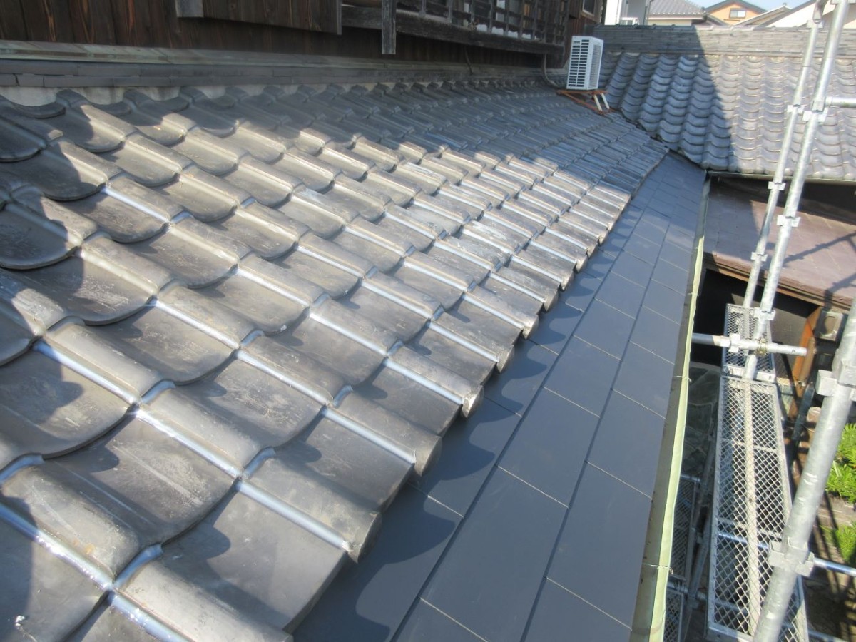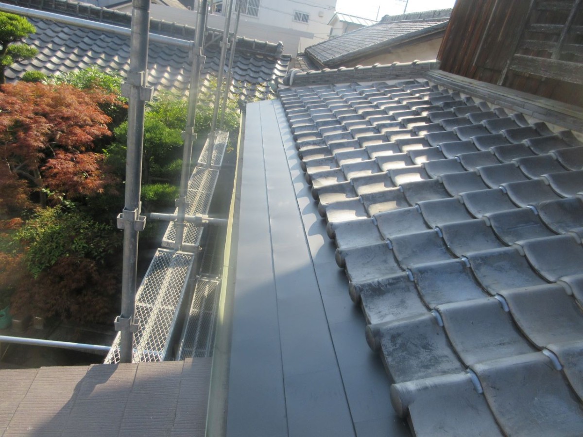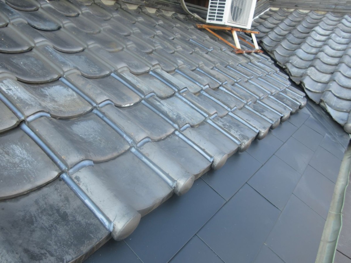 ルーフィング施工後、仕上げの一文字葺き・谷板を施工し、瓦を復旧して屋根工事完了です。