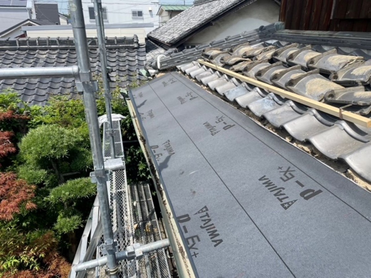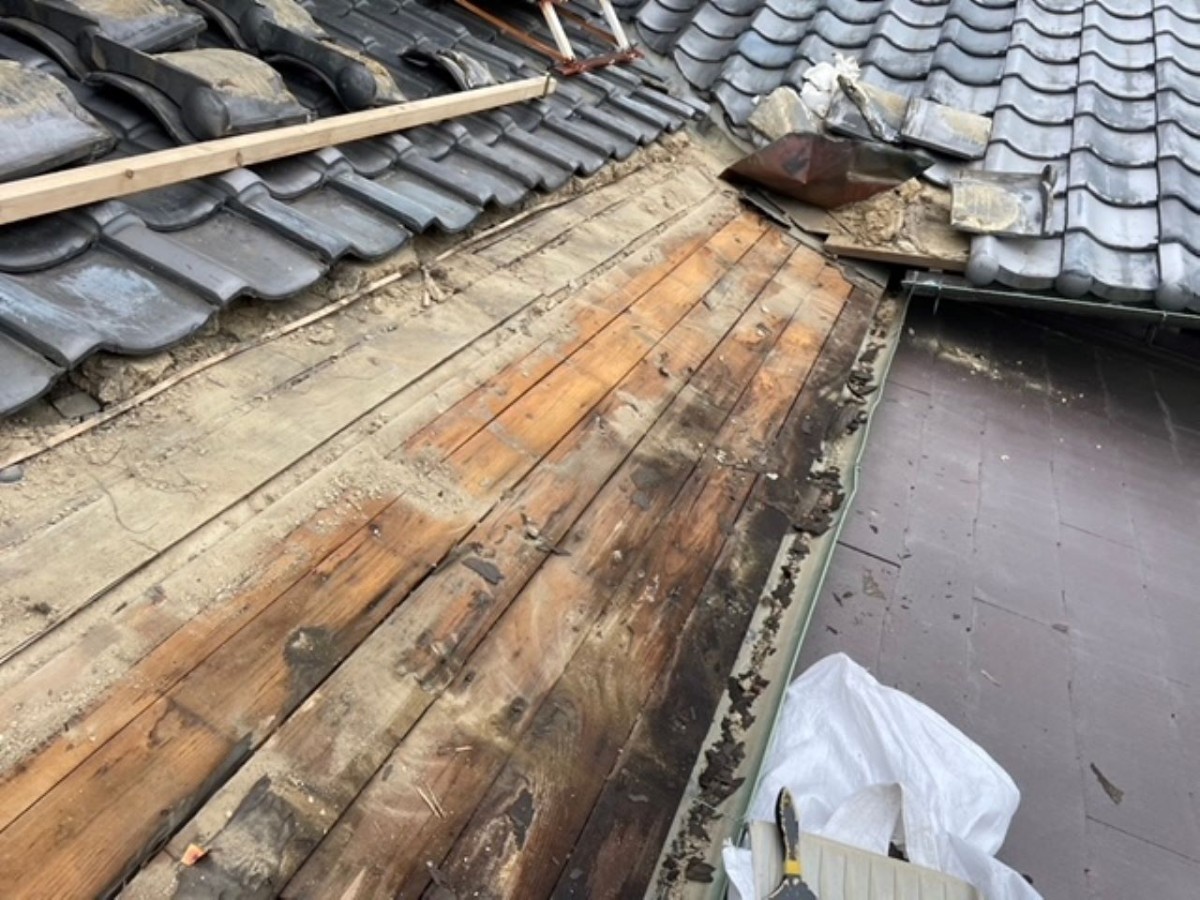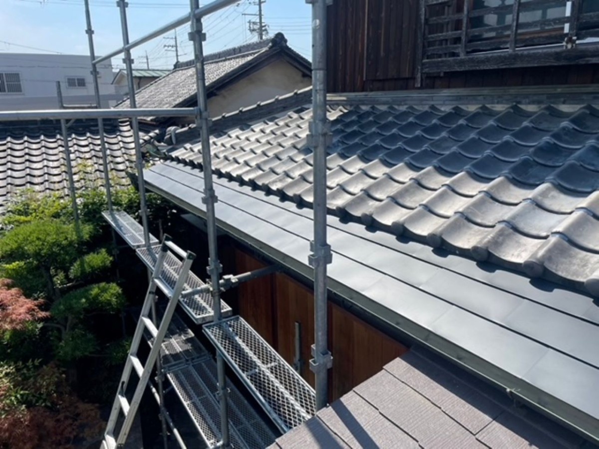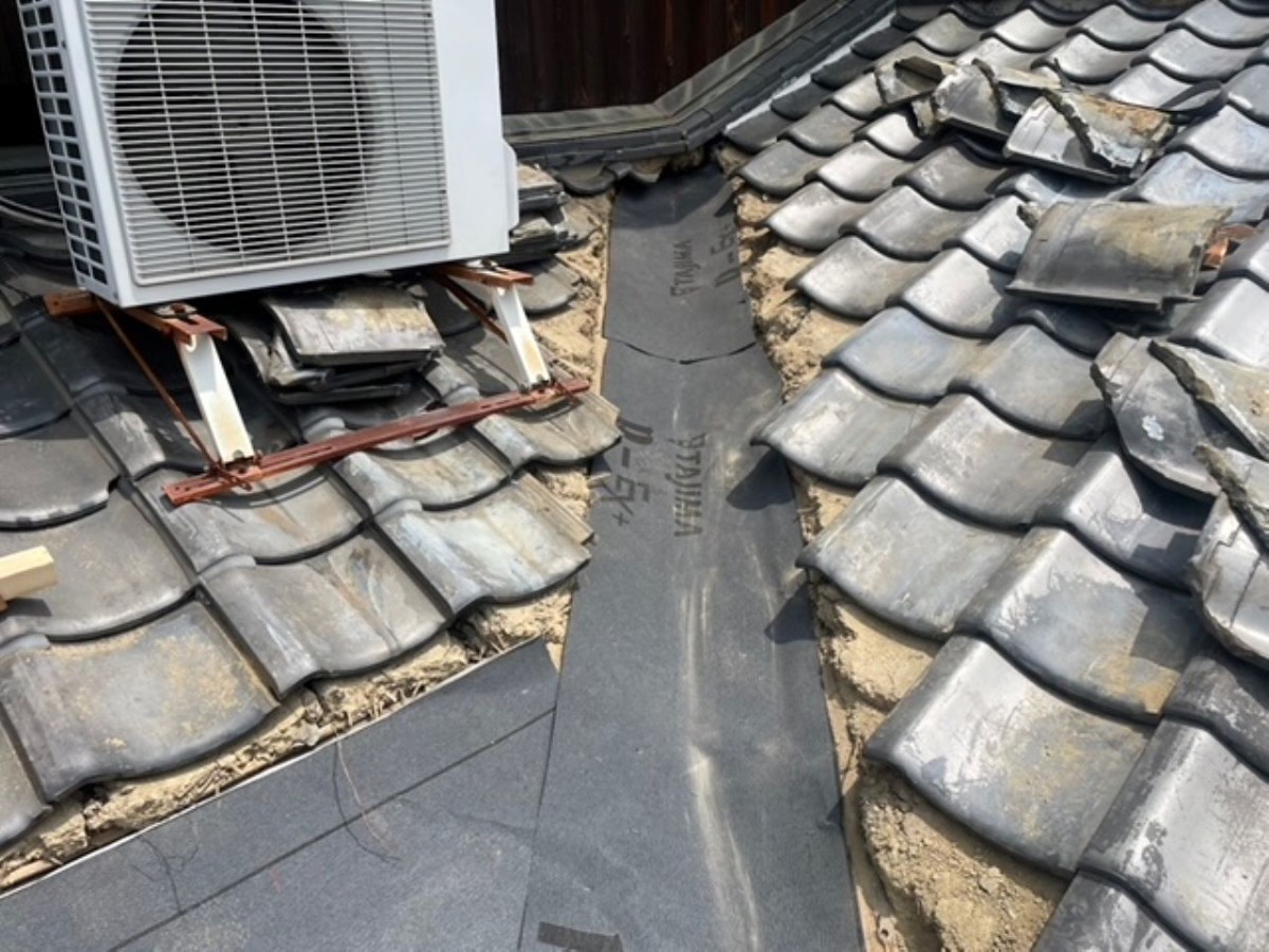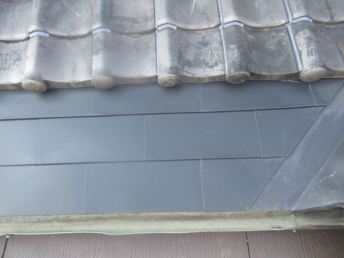 ルーフィング施工後、仕上げの一文字葺き・谷板を施工し、瓦を復旧して屋根工事完了です。
