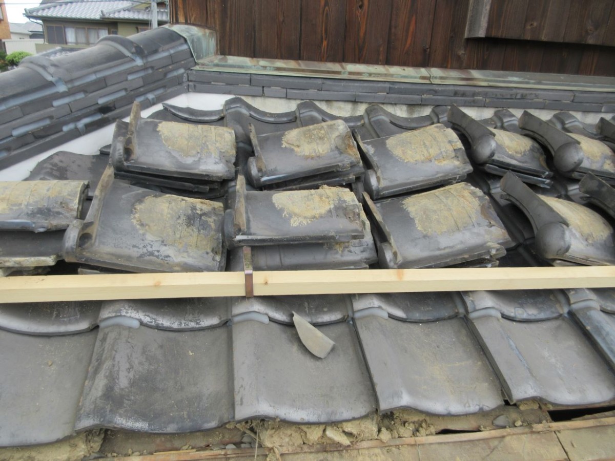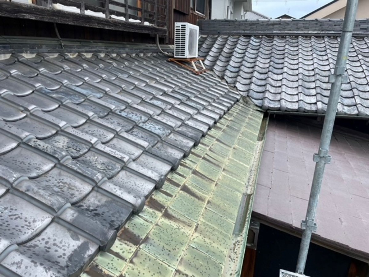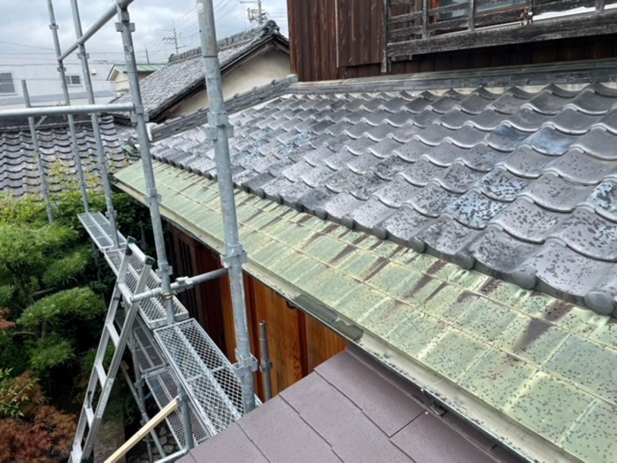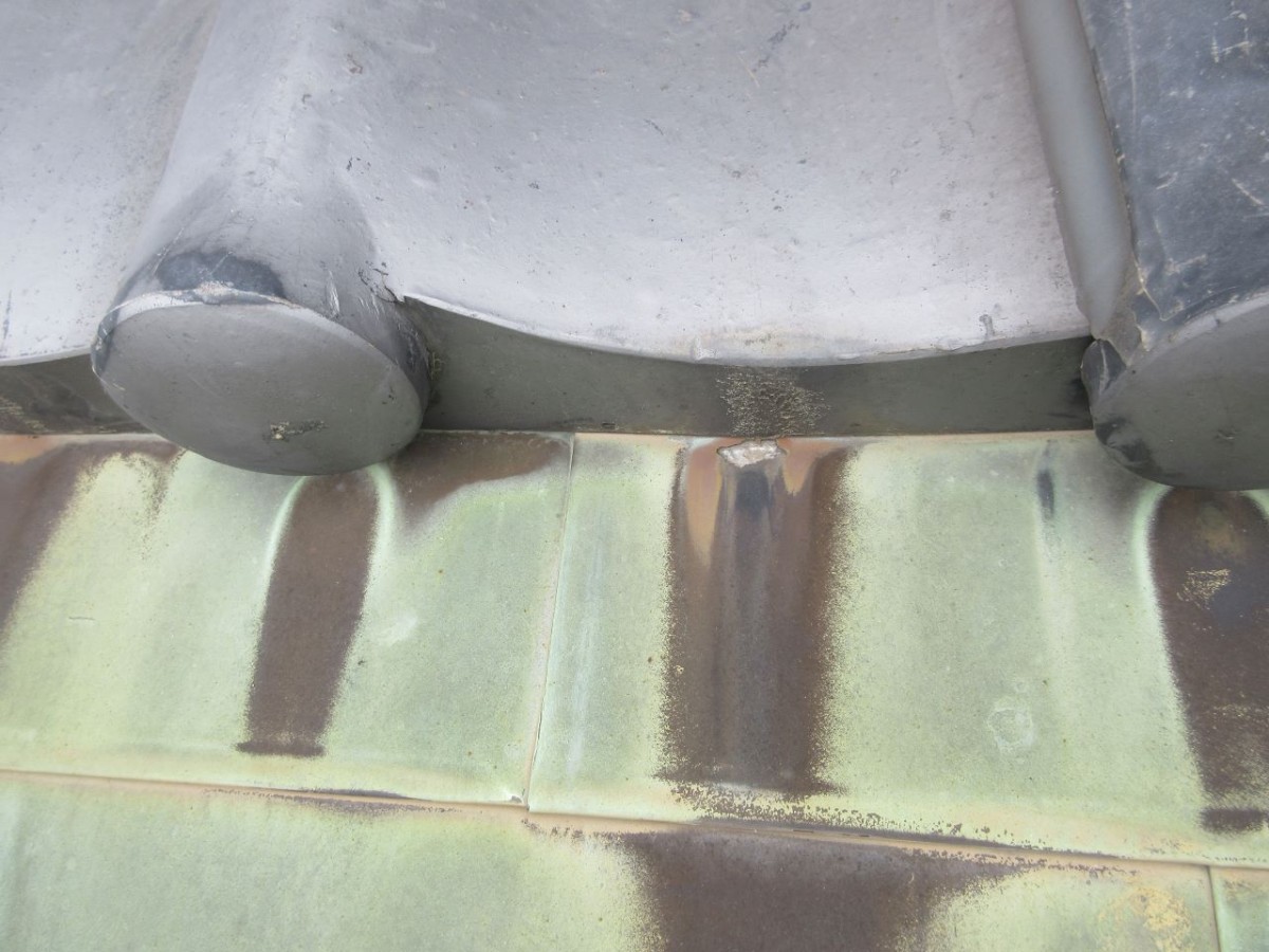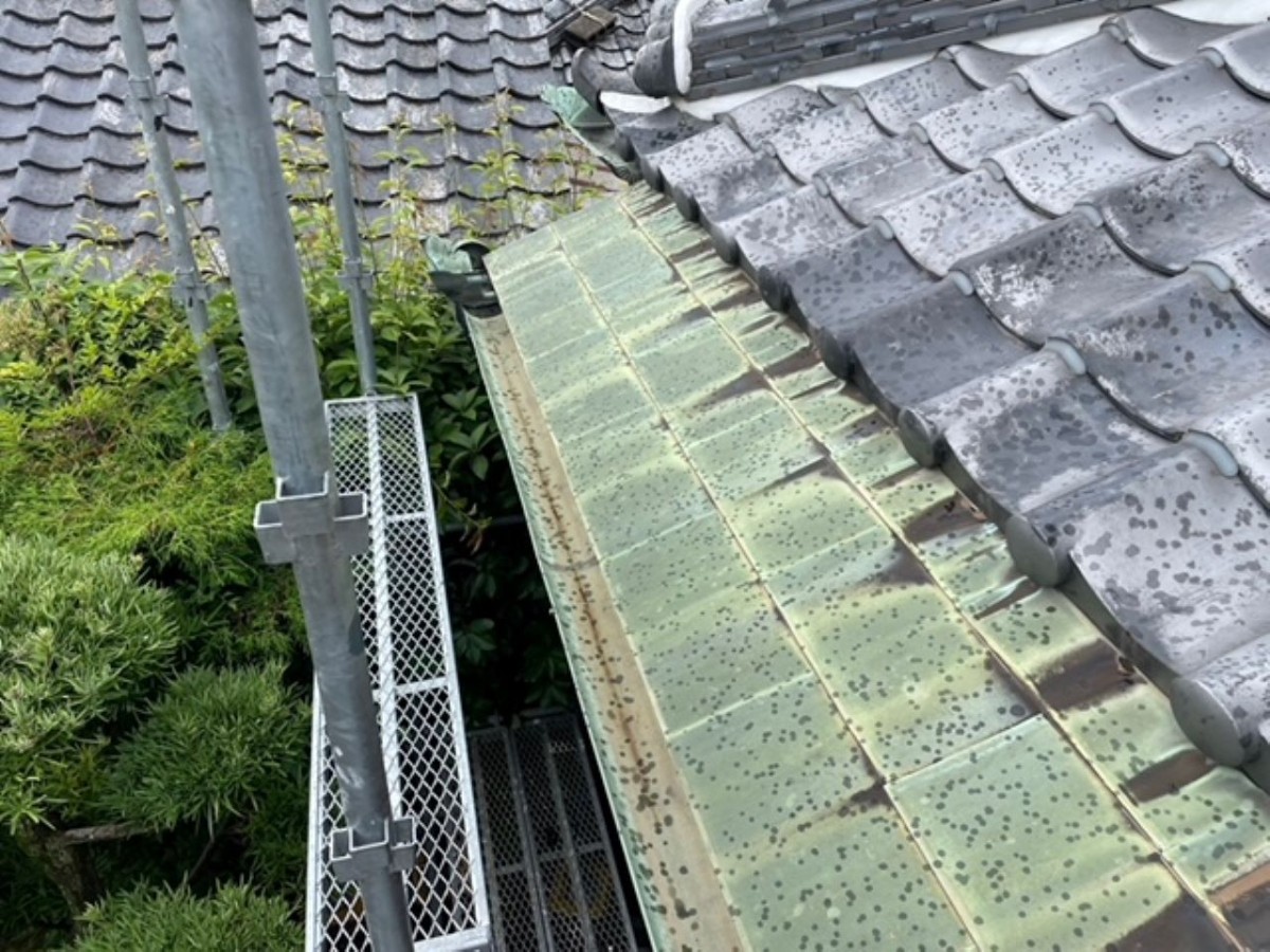 軒先の一文字葺き銅板は上部瓦下部まで入れ込んである為、既存銅板を撤去するには、瓦を2段ほど一時的にめくらないといけません。
