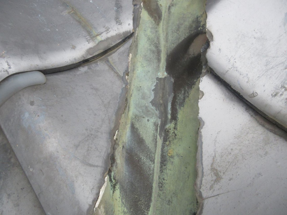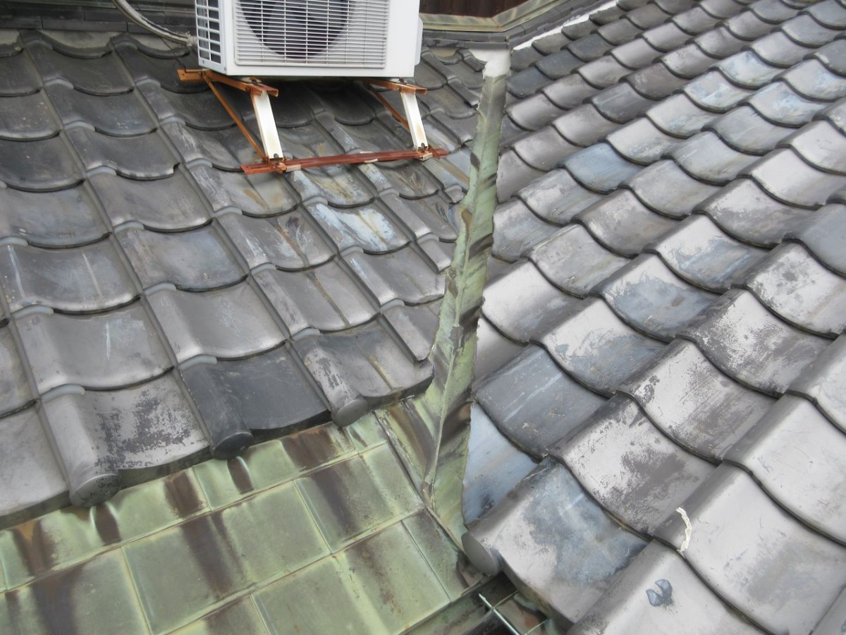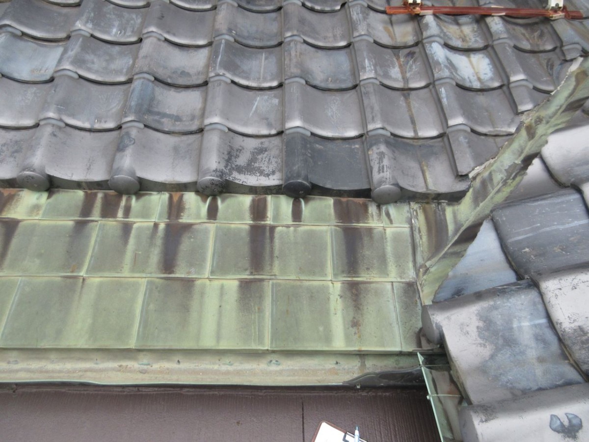 軒先一文字葺き以外に、谷板も同様に銅板に穴が開き、雨漏りを起しておりました。(谷銅板の穴開きはコーキング補修済みでした)