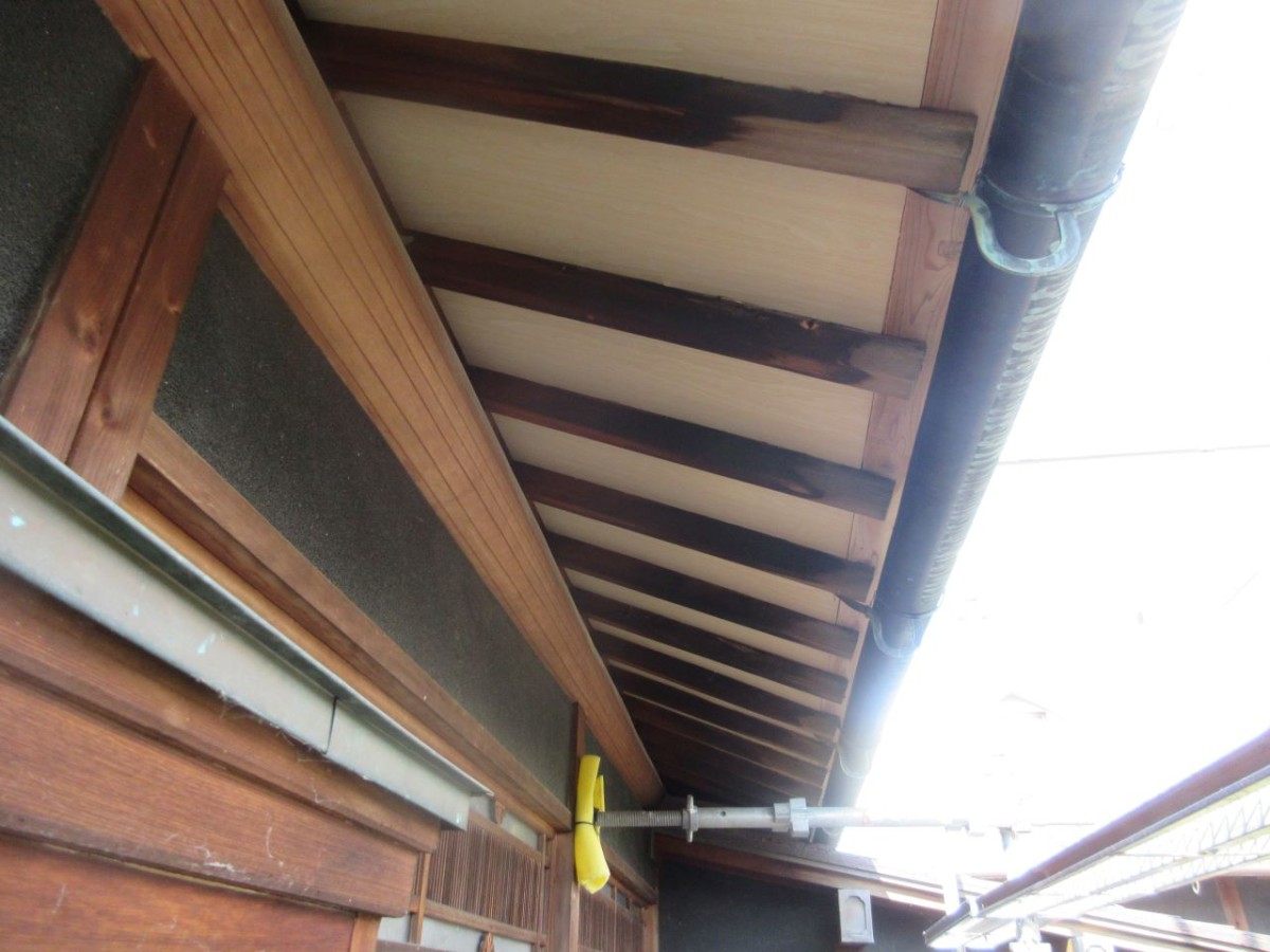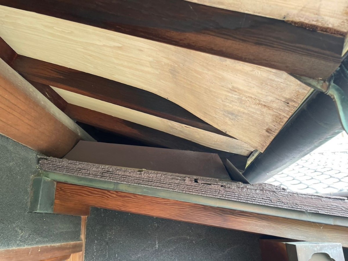 銅板に穴が開いている箇所の真下の軒天は板がめくれ、垂れ下がっている状態でした。