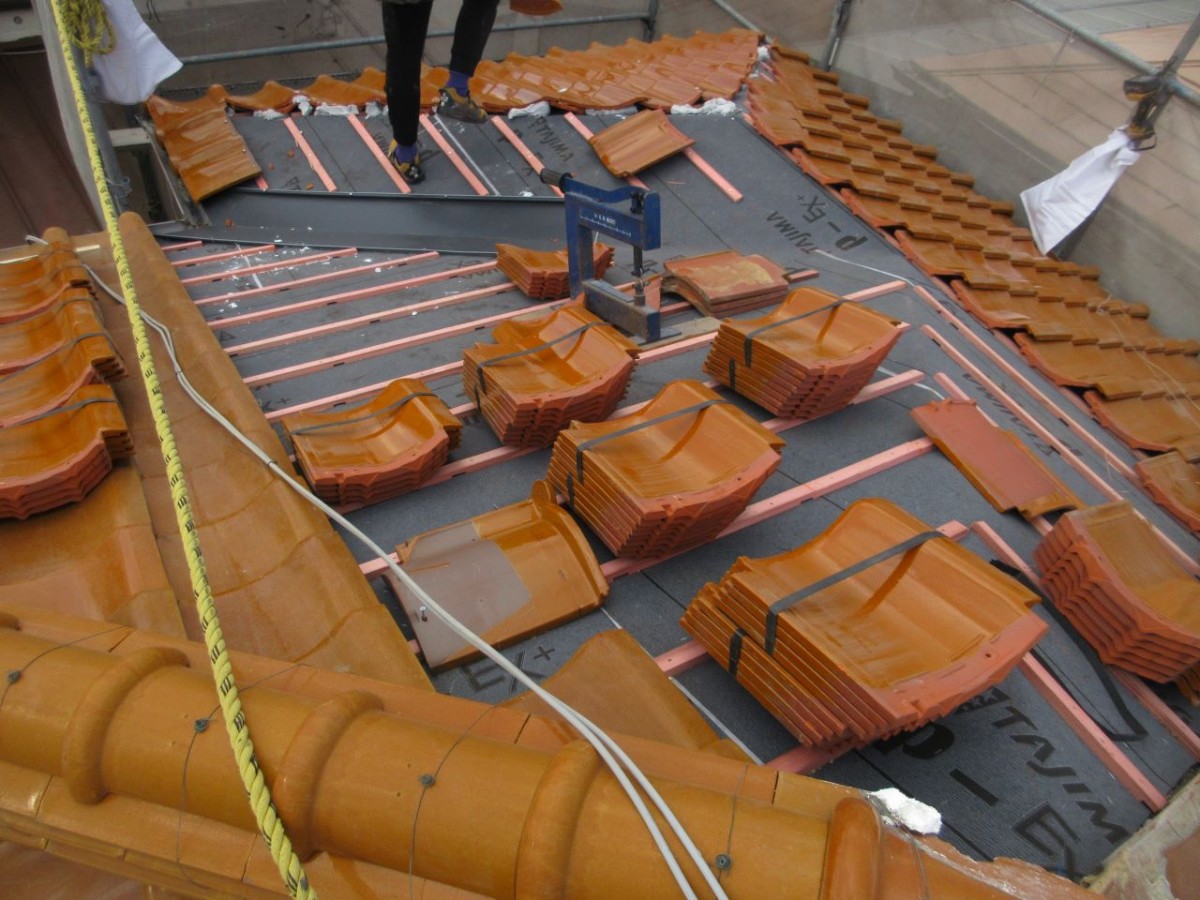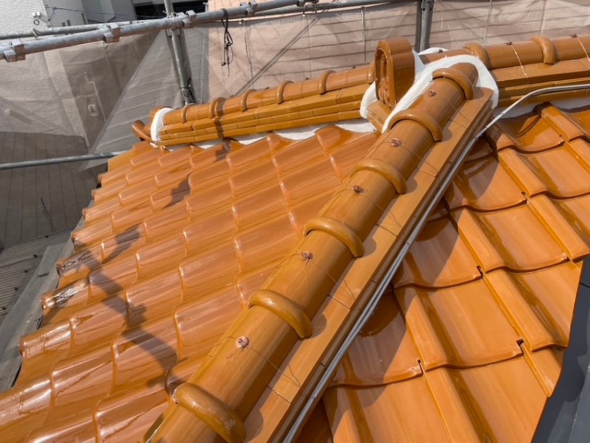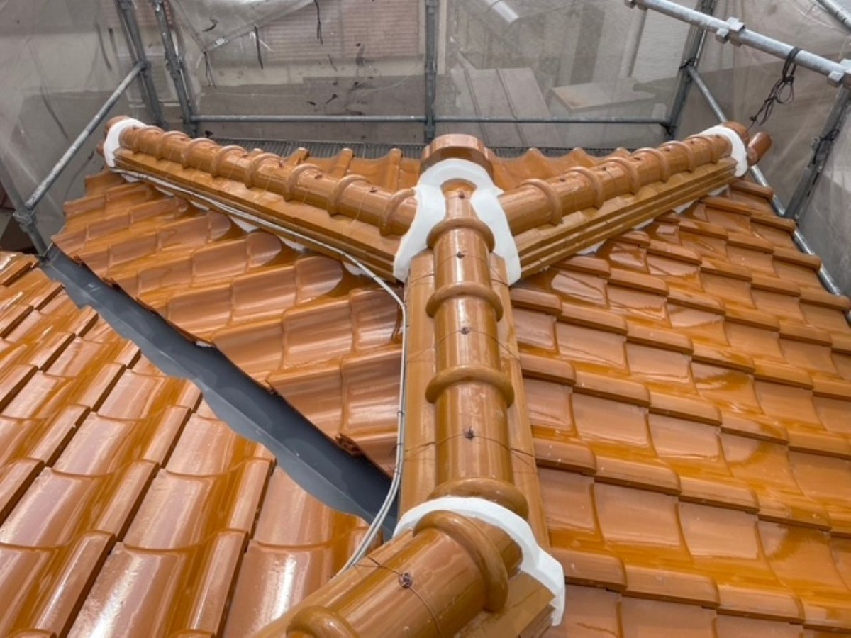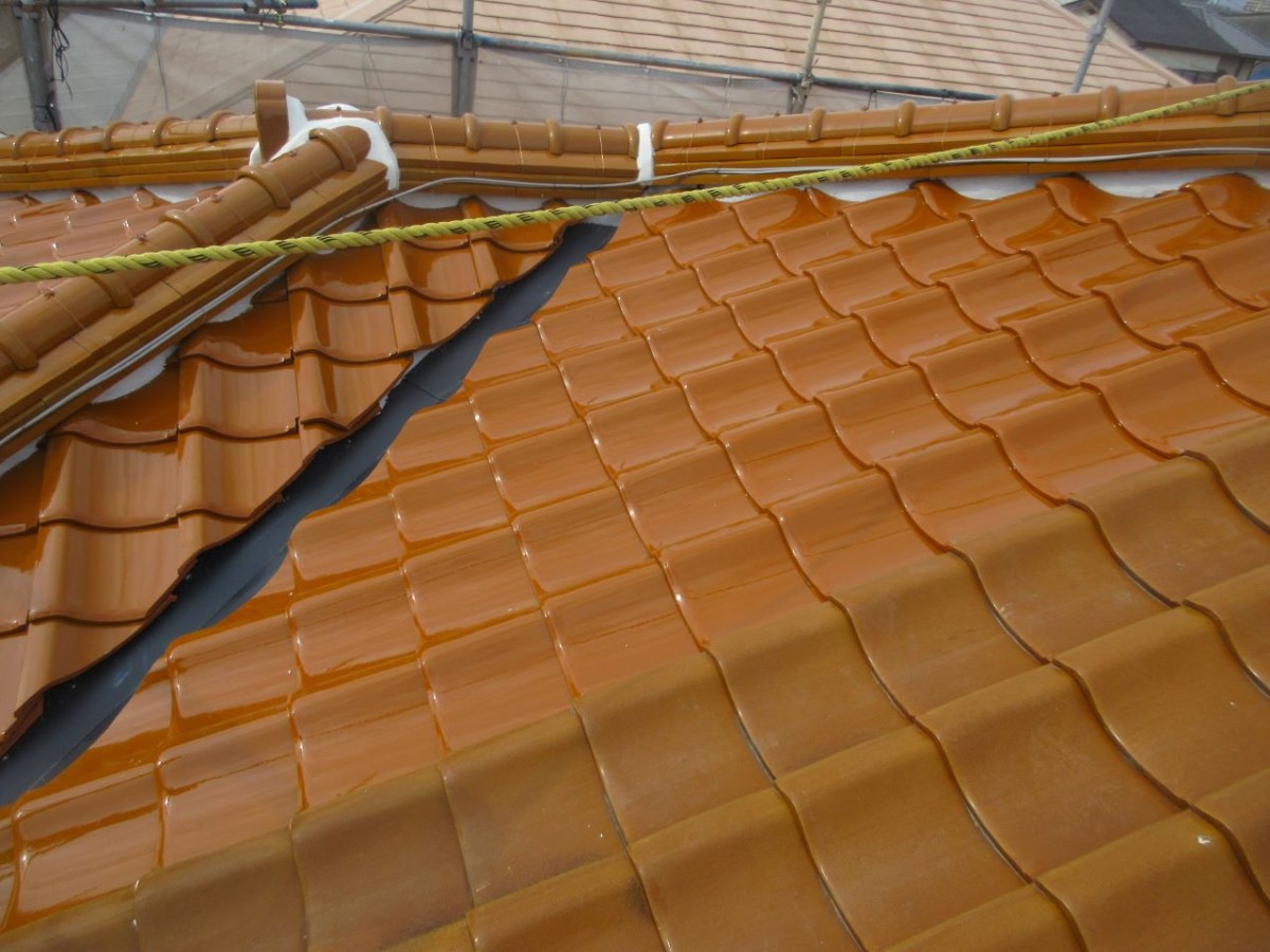 今回の仕上げは、周りの既存屋根と見た目のバランスをとるため、釉薬瓦(オレンジ色)です。