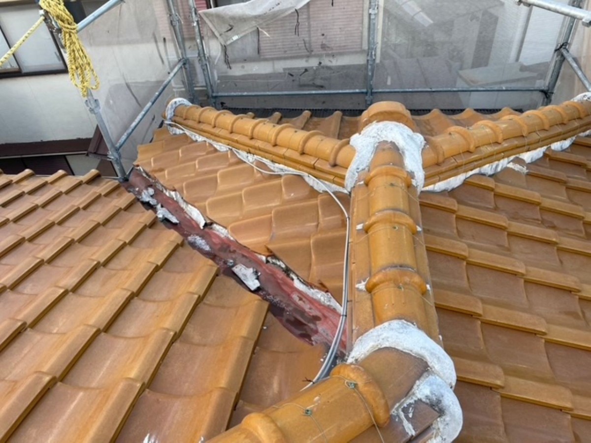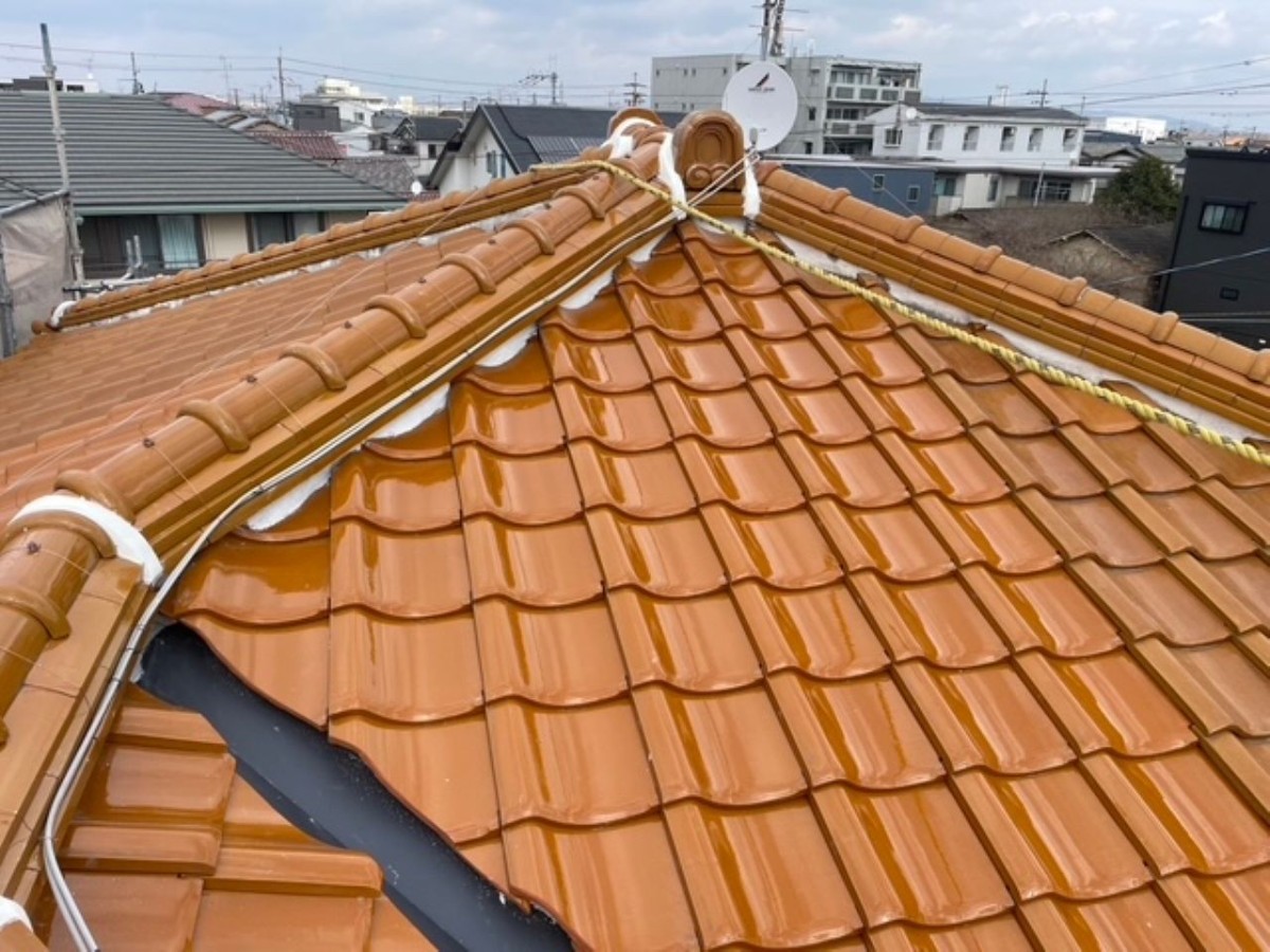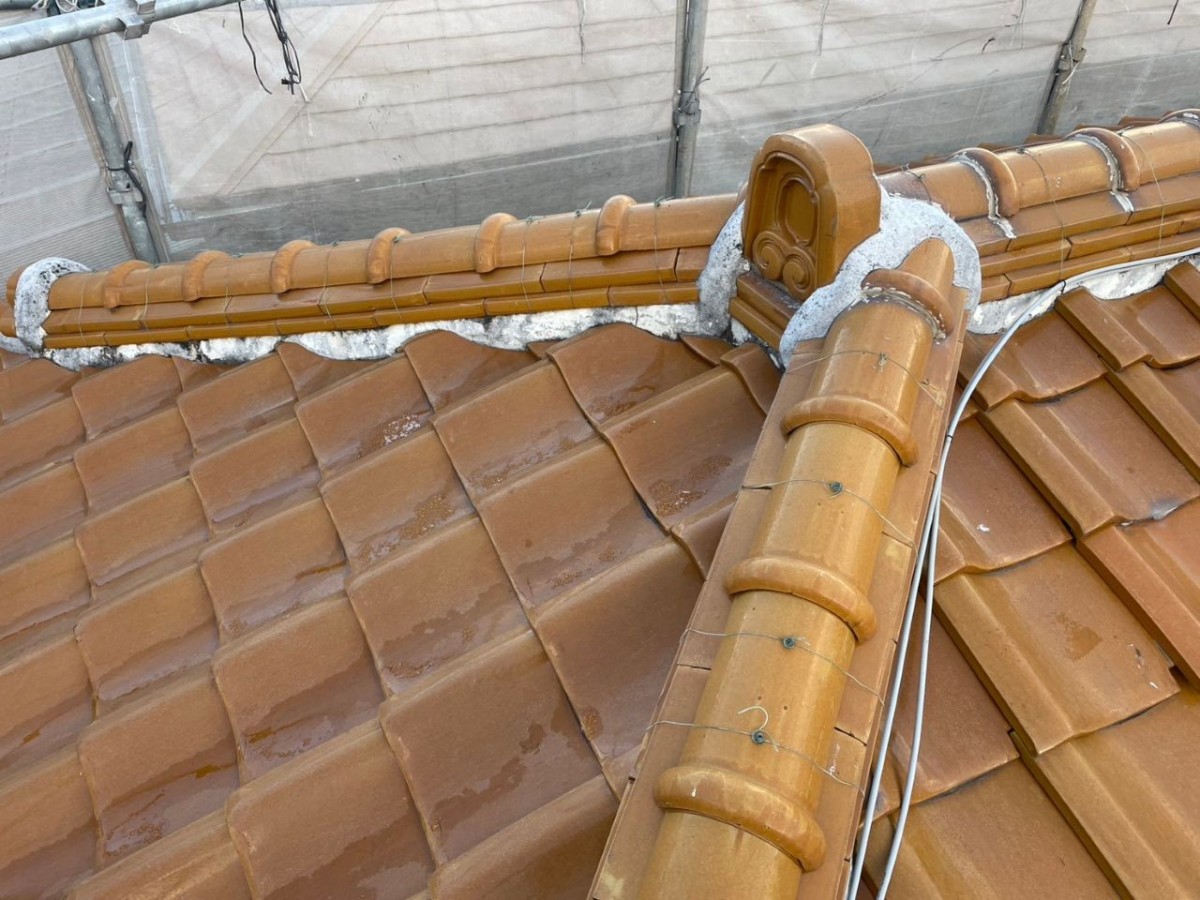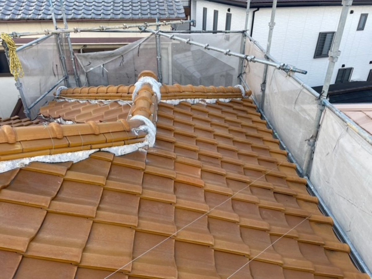 今回の仕上げは、周りの既存屋根と見た目のバランスをとるため、釉薬瓦(オレンジ色)です。