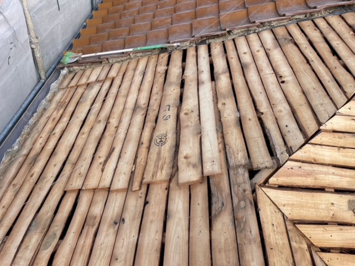 今回は屋根全面葺き替えではなく、雨漏り箇所上部一定範囲のみの部分葺き替え工事の為、工事範囲の瓦と土を撤去致しました。