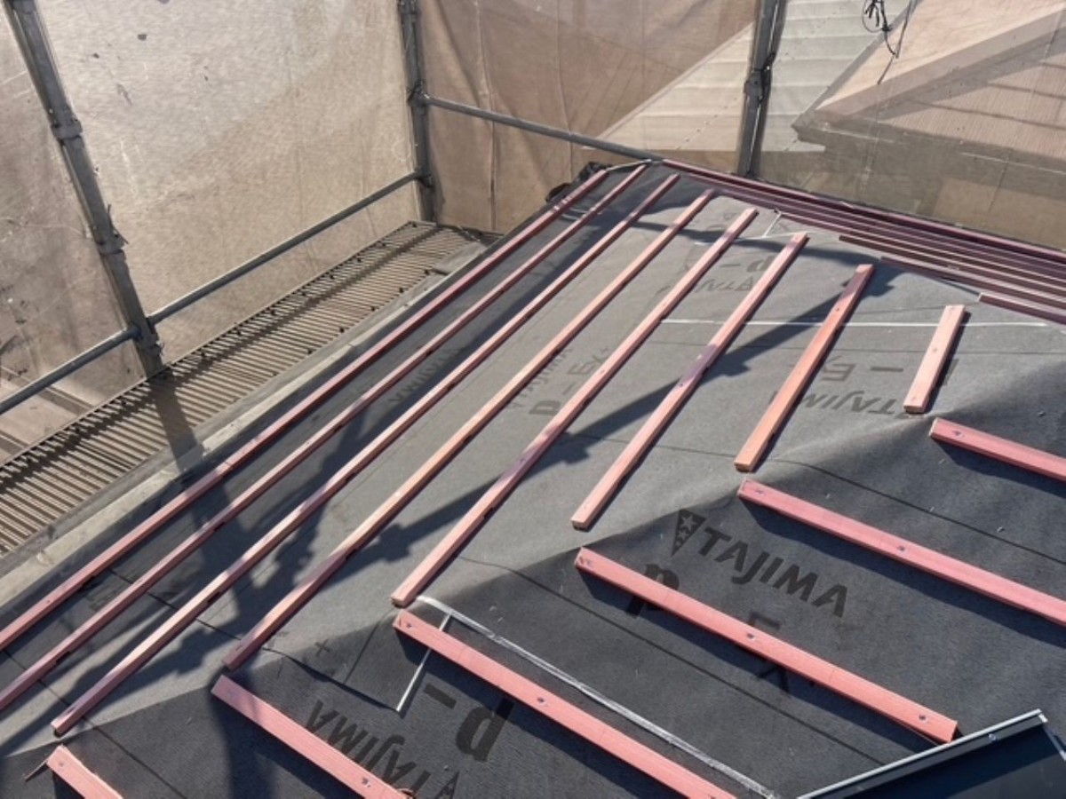 今回、瓦を葺いて仕上げる箇所は桟葺き施工で仕上げる為、桟木を施工致しました。