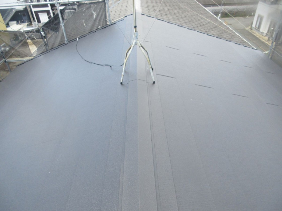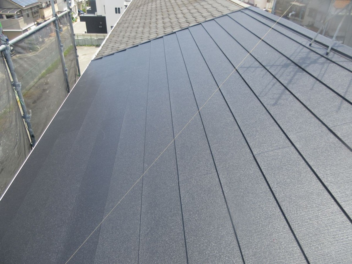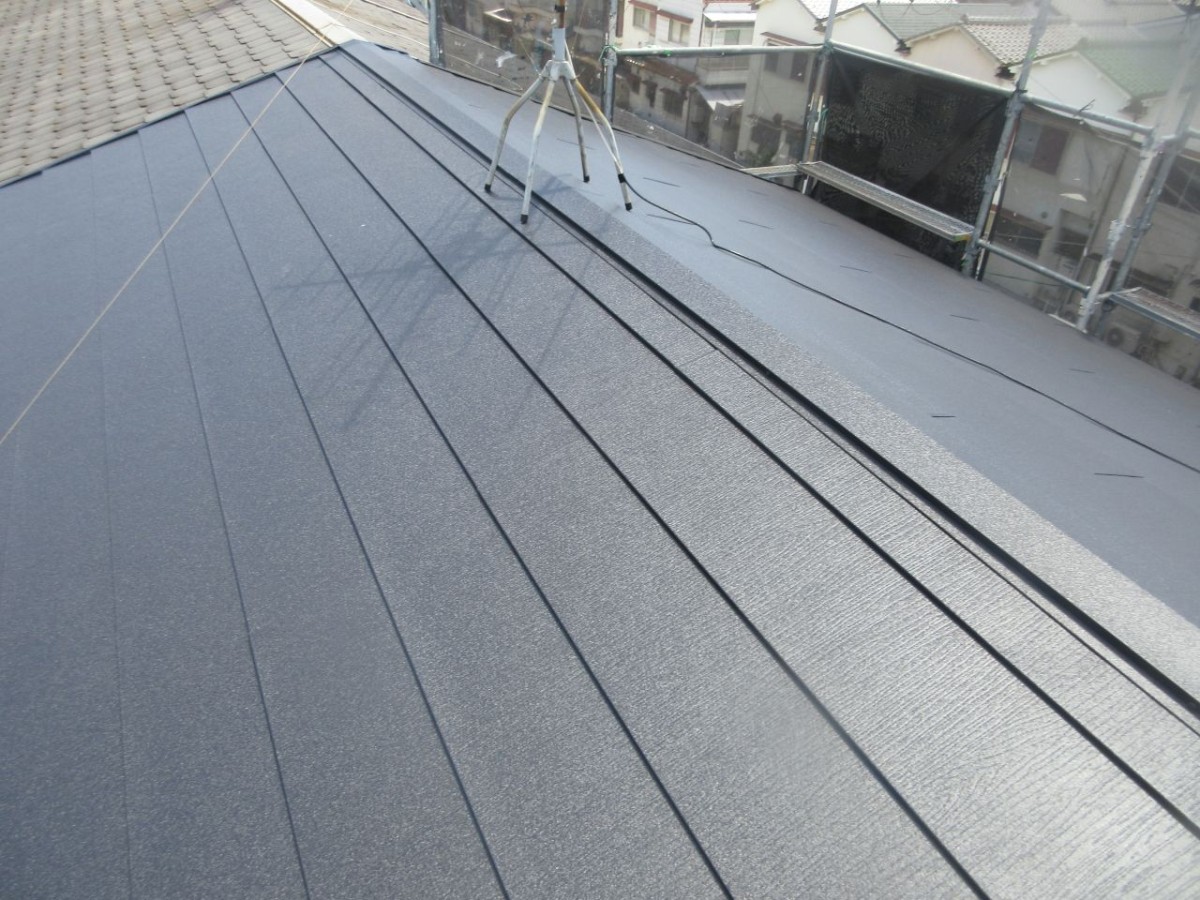 スーパーガルテクト本体葺きを行ない、棟施工を行ない、屋根カバー工法工事完了です。