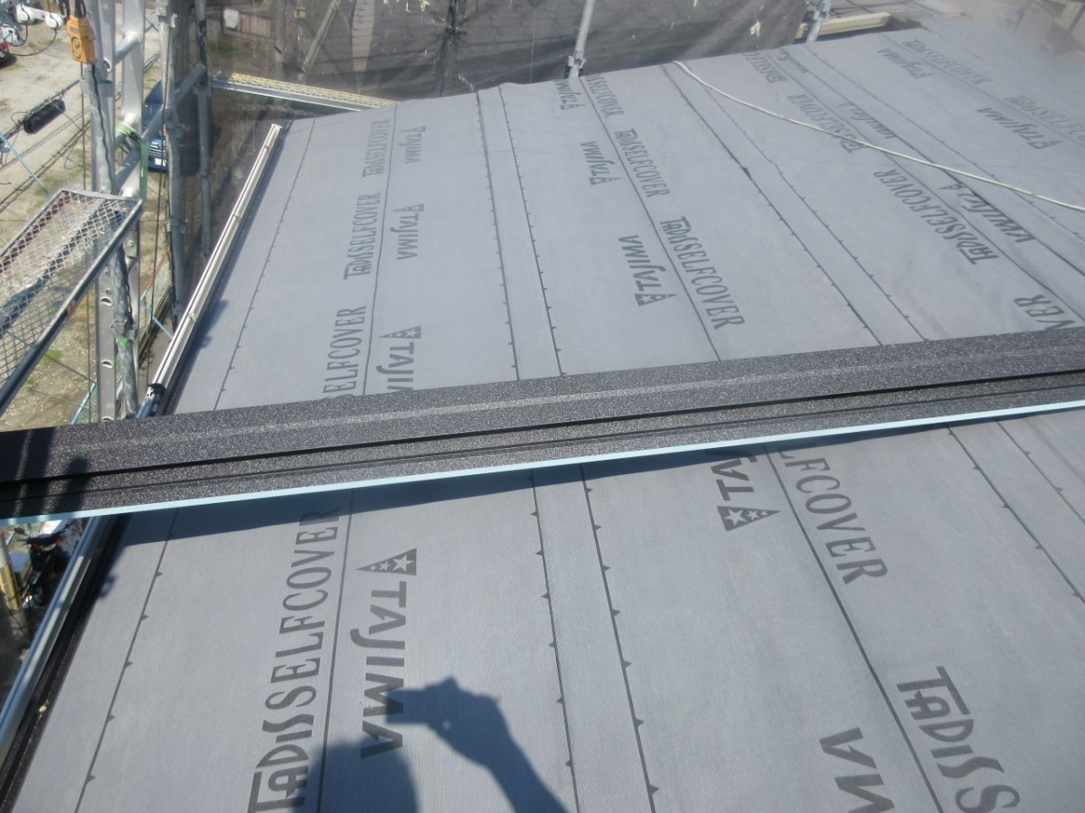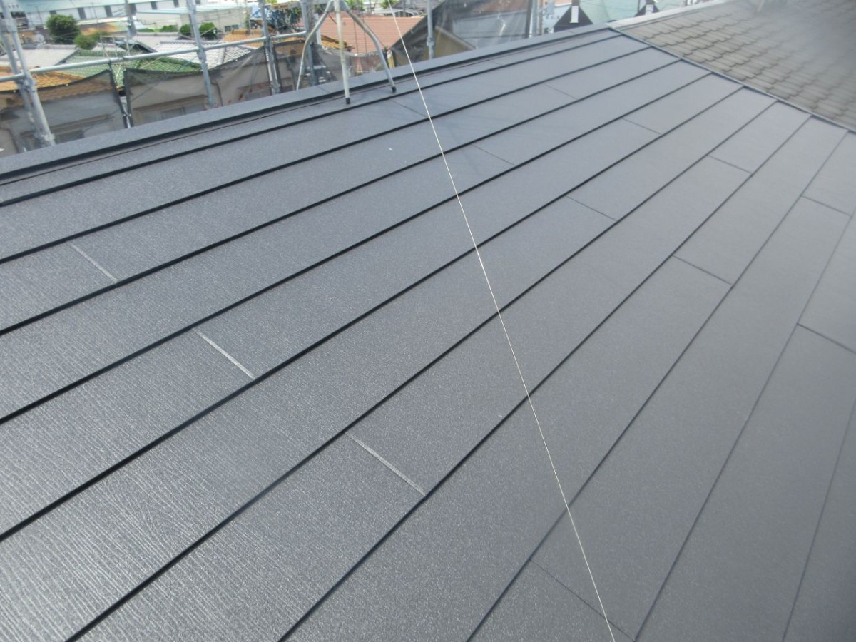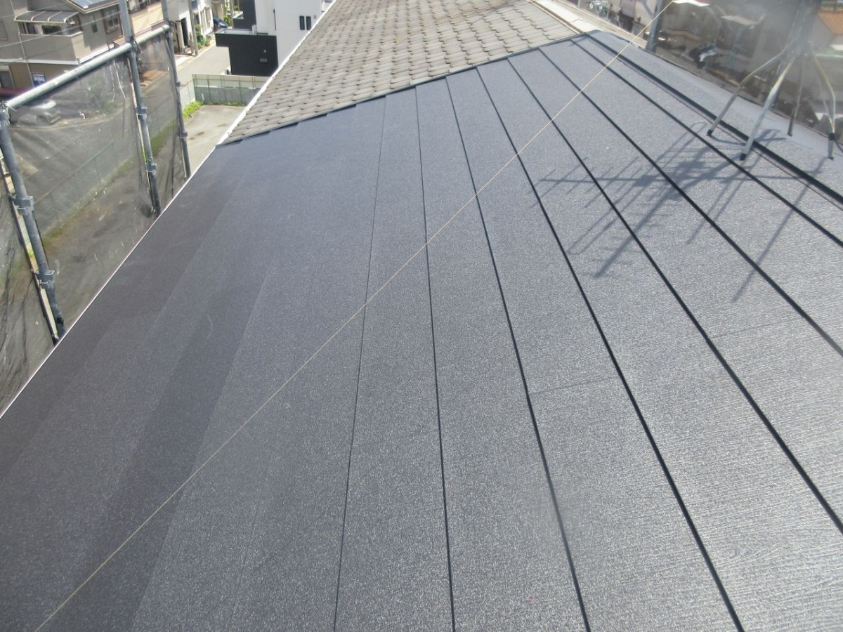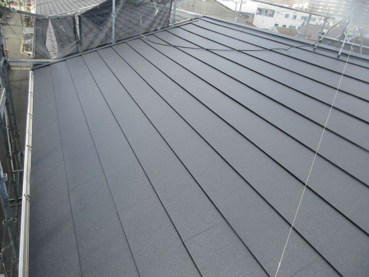 スーパーガルテクト本体葺きを行ない、棟施工を行ない、屋根カバー工法工事完了です。
